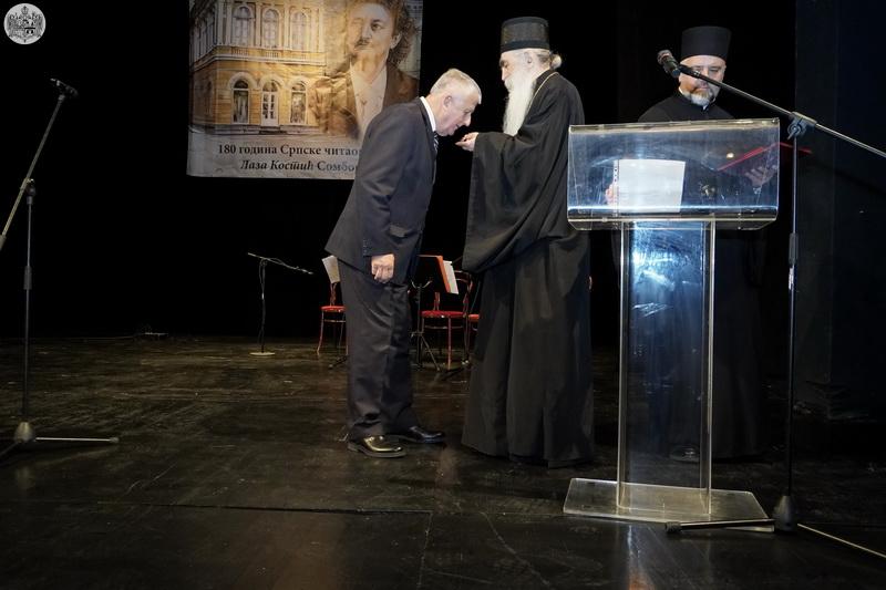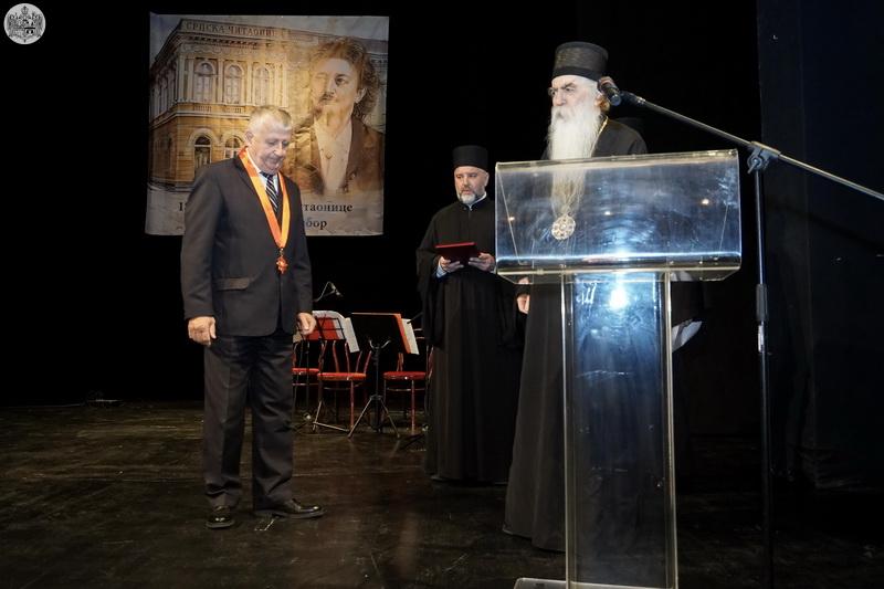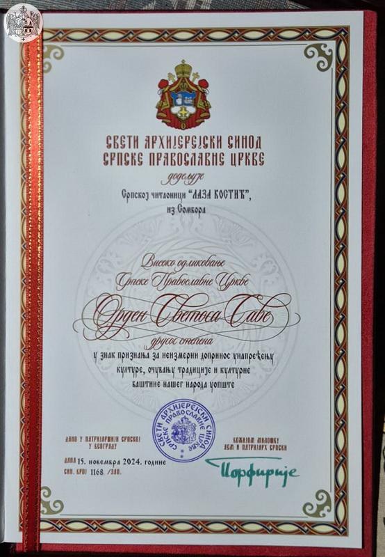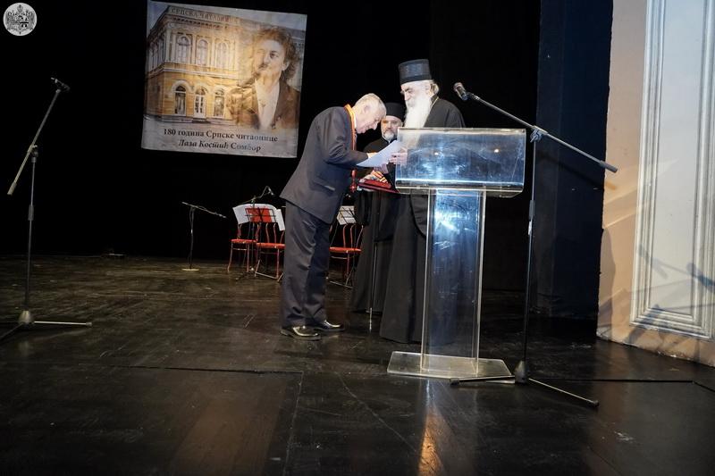 По завршетку обраћања, Високопреосвећени митрополит Иринеј је уручио господину Бориславу Аврамовићу орден Светог Саве другог степена, који је Свети Архијерејски Синод доделио Српској читаоници „Лаза Костићˮ из Сомбора, у знак признања за неизмерни допринос унапређењу културе, очувању традиције и културне баштине нашег народа уопште. Господин Аврамовић је захвалио на високом одликовању и Митрополиту бачком Иринеју уручио захвалницу Српске читаонице.