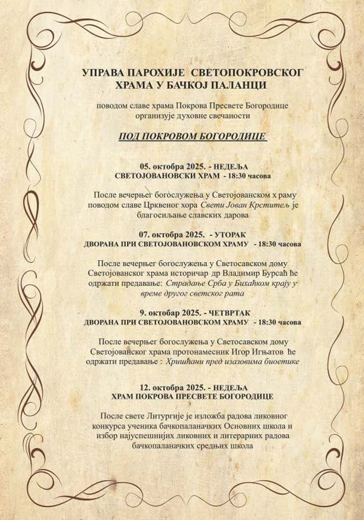 Са благословом Његовог Високопреосвештенства Митрополита бачког господина др Иринеја, поводом славе храма Покрова Пресвете Богородице у Бачкој Паланци, Управа парохије при наведеном храму, од 5. до 12. октобра 2025. године организује духовне свечаности под називом „Под Покровом Богородице”, са следећим програмом:
