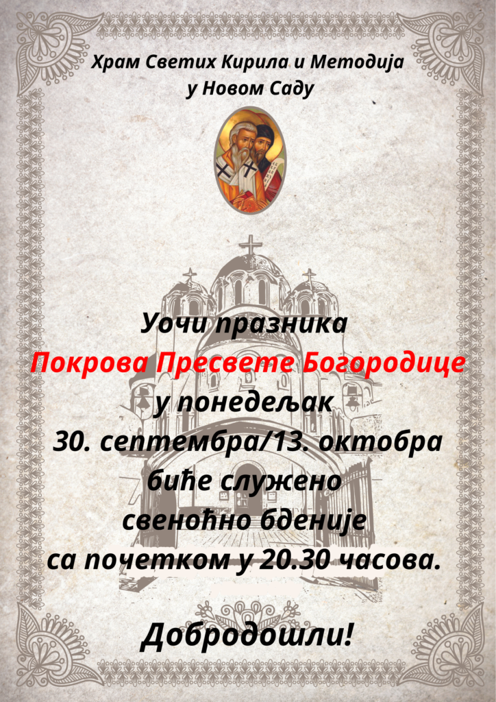 Са благословом Његовог Високопреосвештенства Митрополита бачког господина др Иринеја, у понедељак, 13. октобра 2025. године, са почетком у 20:30 часова, у храму Светих Кирила и Методија на Телепу у Новом Саду биће служено свеноћно бденије поводом празника Покрова Пресвете Богородице.