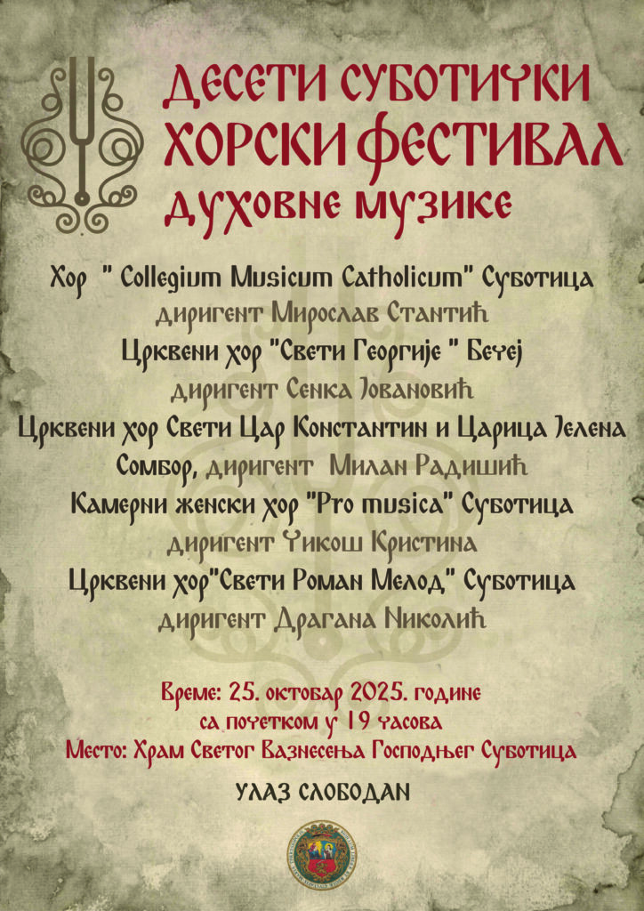 Са благословом Његовог Високопреосвештенства Митрополита бачког господина др Иринеја, у суботу, 25. октобра 2025. године, у Световазнесенском храму у Суботици, одржаће се десети суботички хорски Фестивал духовне музике.