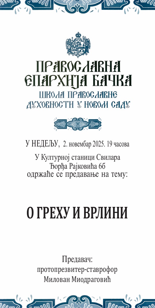 У оквиру јесењег семестра Школе православне духовности при Црквеној општини новосадској, у недељу, 2. новембра 2025. године, са почетком у 19:00 часова, у дворани Културне станице „Свилараˮ у Новом Саду, протојереј-ставрофор Милован Миодраговић ће одржати предавање на тему „О греху и врлиниˮ.