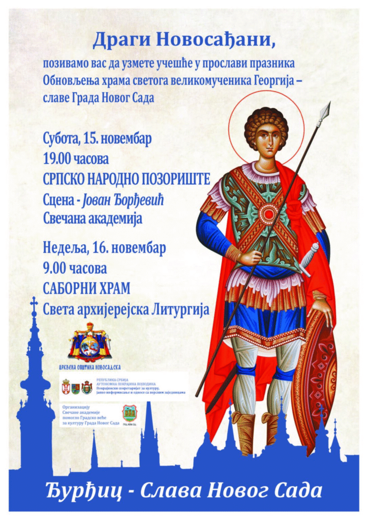 Слава Града Новог Сада, празник Обновљења храма Светог великомученика Георгија – Ђурђиц, биће свечано прослављена у недељу, 16. новембра 2025. године.