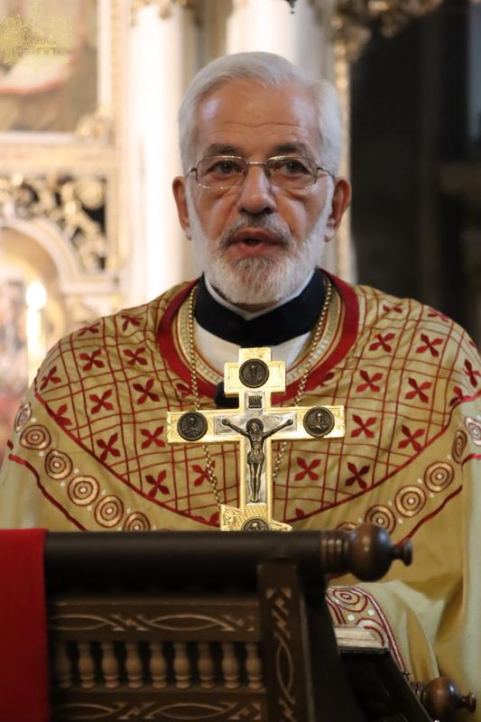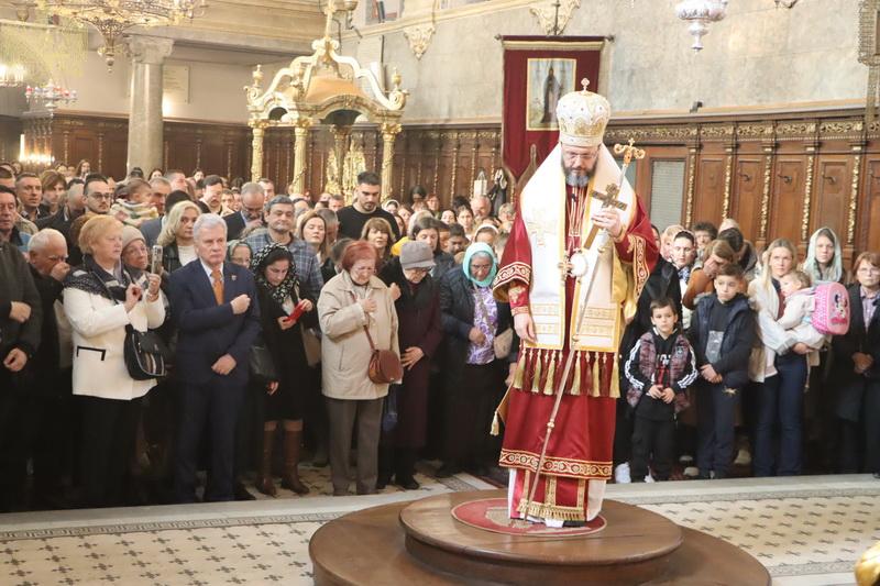 На светој архијерејској Литургији началствовао је Његово Преосвештенство Епископ мохачки господин Дамаскин, уз саслужење свештенства Епархије бачке и новосадских ђакона. После прочитаног јеванђелског зачала, по благослову епископа Дамаскина, протојереј-ставрофор Милош Весин је произнео беседу у којој је истакао: „Данас сви ми заједно прослављамо Обновљење храма светог великомученика Георгија. Ово је наша заједничка градска слава. И величина светог Георгија управо јесте у томе ,што је својим животом и својим страдањем доказао да је увек имао и на уму и у срцу дубоко урезане ове Христове речи: Трпљењем својим спасавајте душе своје. А то је оно што данашњи човек и неће, а са друге стране и не уме. Не уме да трпи, неће да трпи. И као директан резултат неумећа или немања воље да се трпи, онда се губи стрпљење. И сваки пут када чујете да је неко нестрпљив, знајте да се нестрпљење према другима увек корени у нестрпљењу према самоме себи. Свети великомученик Георгије је много тога морао да претрпи, доказавши да је управо трпљењем својим постао заштитник оних који су у оно време били обесправљени, али добивши благослов Божји, јер Господ увек препознаје оне који Њега признају и који се у Њега облаче. То облачење у Христа није ништа друго него наше духовно сазревање, наш напредак, да свако уме у оном који је поред њега, без обзира ко је, које вере, које крви, ког имена, ког језика, да препозна свога ближњег. Зашто? Зато што смо и ближњи и ја створени по лику Божјем. Свако је једна ходајућа икона Божја и свако би, према томе, тако требало да се односи према сваком човеку, јер сваки човек, ма из ког разлога да се налази у моме животу, тог човека је Бог поставио на моју животну стазу или је пак мене ставио на животну стазу те особе. Другим речима, сви смо поверени бризи и љубави једни другима.ˮ