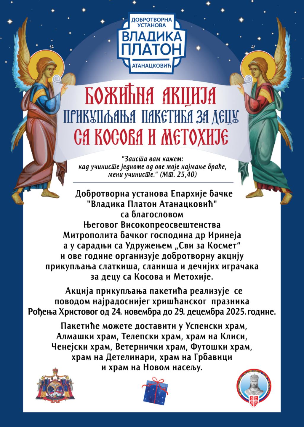 Са благословом Његовог Високопреосвештенства Митрополита бачког господина др Иринеја, поводом предстојећег празника Рођења Христова, Добротворна установа Епархије бачке „Владика Платон Атанацковићˮ, у сарадњи са хуманитарном организацијом „Сви за Косметˮ, и ове године организује добротворну акцију прикупљања слатких и сланих производа, као и дечјих играчака за децу са Косова и Метохије. Акција ће се организовати у периоду од 24. новембра до 29. децембра 2025. године. Пакетићи се могу донети у Успенски и Алмашки храм, храмове на Ченеју, Клиси, Телепу, Детелинари, Грбавици и Новом насељу, као и у храмове у Ветернику и Футогу.