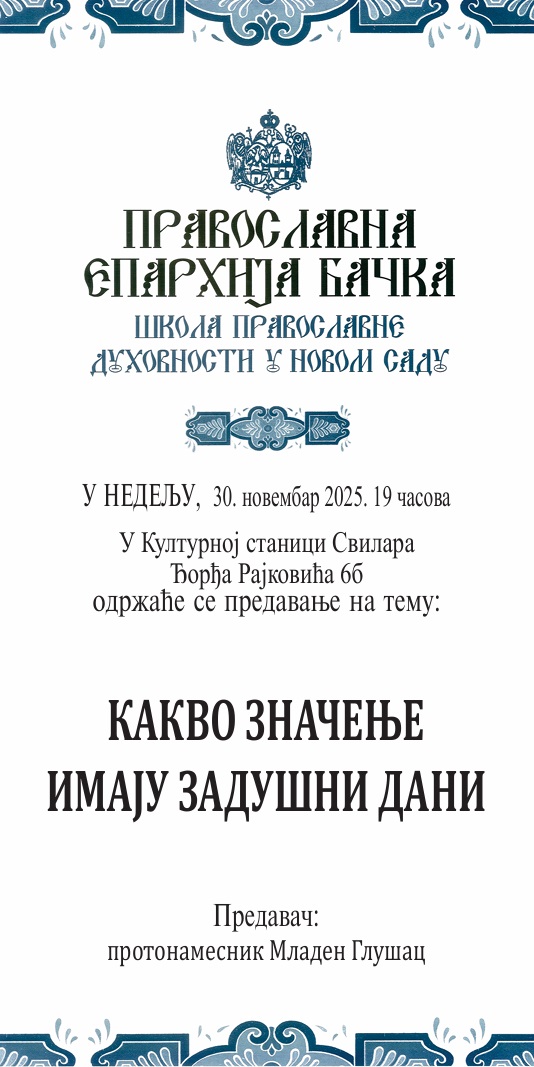У оквиру јесењег семестра Школе православне духовности при Црквеној општини новосадској, у недељу, 30. новембра 2025. године, са почетком у 19:00 часова, у дворани Културне станице „Свилараˮ у Новом Саду, протонамесник Младен Глушац ће одржати предавање на тему „Какво значење имају задушни даниˮ.