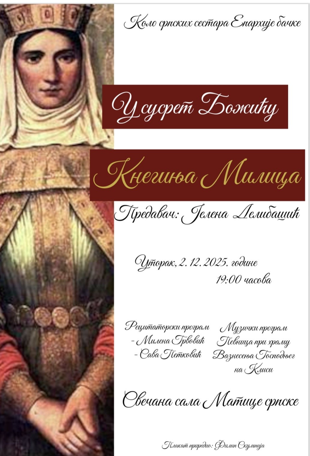 - 2. децембар: Јелена Делибашић, предавање на тему „Кнегиња Милицаˮ