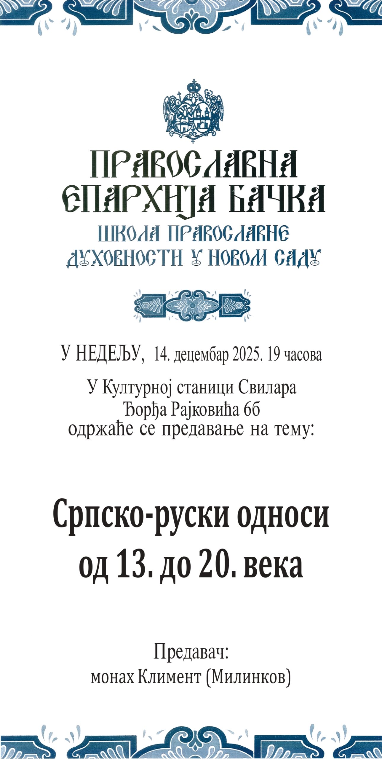 У оквиру јесењег семестра Школе православне духовности при Црквеној општини новосадској, у недељу, 14. децембра 2025. године, са почетком у 19:00 часова, у дворани Културне станице „Свилараˮ у Новом Саду, монах Климент (Милинков) ће одржати предавање на тему „Српско-руски односи од 13. до 20. векаˮ.