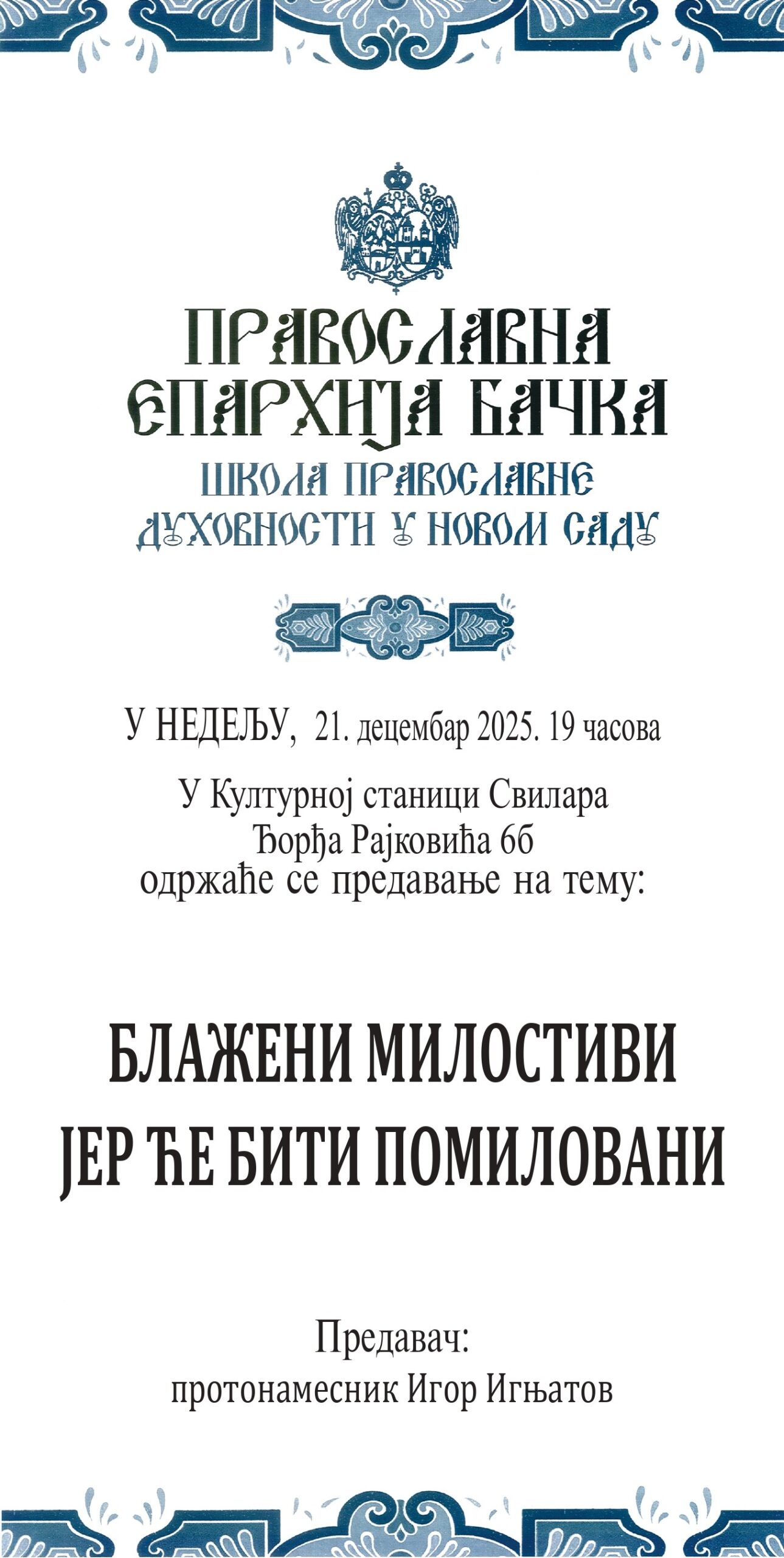 У оквиру јесењег семестра Школе православне духовности при Црквеној општини новосадској, у недељу, 21. децембра 2025. године, са почетком у 19:00 часова, у дворани Културне станице „Свилараˮ у Новом Саду, протонамесник Игор Игњатов ће одржати предавање на тему „Блажени милостиви јер ће бити помилованиˮ.