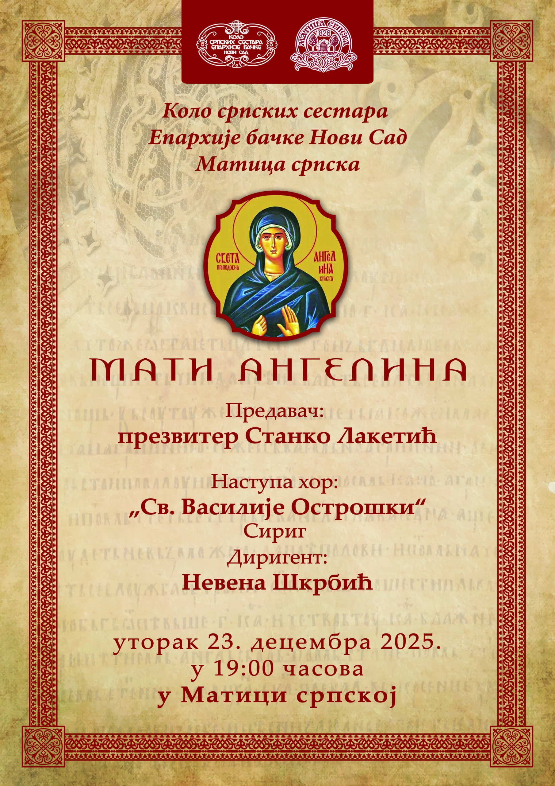 Са благословом Његовог Високопреосвештенства Митрополита бачког господина др Иринеја, у оквиру циклуса предавањâ под називом „У сусрет Божићу – знамените Српкињеˮ које током Божићног поста организује Коло српских сестара Епархије бачке, презвитер Станко Лакетић ће одржати предавање на тему „Мати Ангелинаˮ. Предавање ће бити одржано у свечаној дворани Матице српске у Новом Саду, у уторак, 23. децембра 2025. године, са почетком у 19:00 часова.