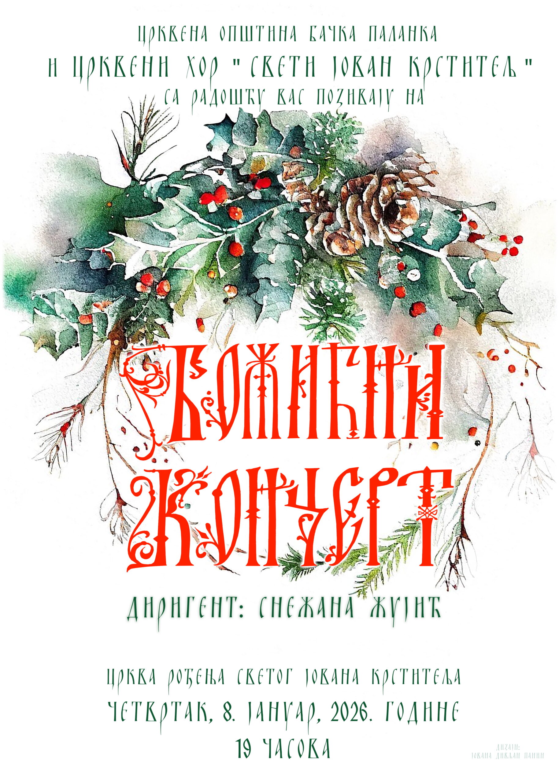 На празник Сабора Пресвете Богородице, у четвртак, 8. јануара 2026. године, после вечерњег богослужења, у 19:00 часова, Црквени хор „Свети Јован Крститељˮ приредиће традиционални божићни концерт у Светојовановском храму у Бачкој Паланци. Хор ће наступити под руководством диригента Снежане Жујић, а представиће се извођењем божићних богослужбених и народних композиција српских и других композитора.