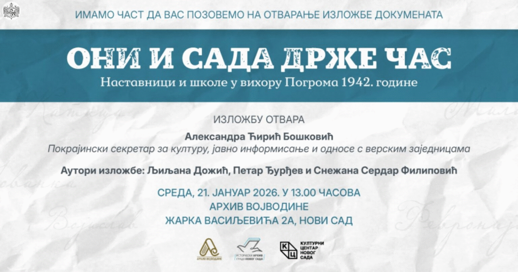 У среду, 21. јануара 2026. године, са почетком у 13:00 часова, у Архиву Војводине у Новом Саду, биће отворена тематска изложба архивских докумената под називом „Они и сада држе час: Наставници и школе у вихору Погрома 1942. годинеˮ.