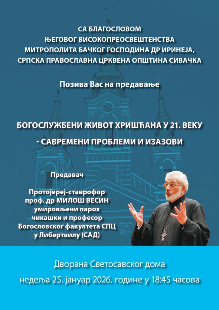 Са благословом Његовог Високопреосвештенства Митрополита бачког господина др Иринеја, Црквена општина у Сивцу, у оквиру петог циклуса предавањâ веронауке за одрасле, организује предавање на тему „Богослужбени живот хришћана у 21. веку – савремени проблеми и изазовиˮ. Предавање ће бити одржано у недељу, 25. јануара 2026. године, са почетком у 18:45 часова, у дворани Светосавског дома у Сивцу. Предавач је протојереј-ставрофор др Милош Весин.