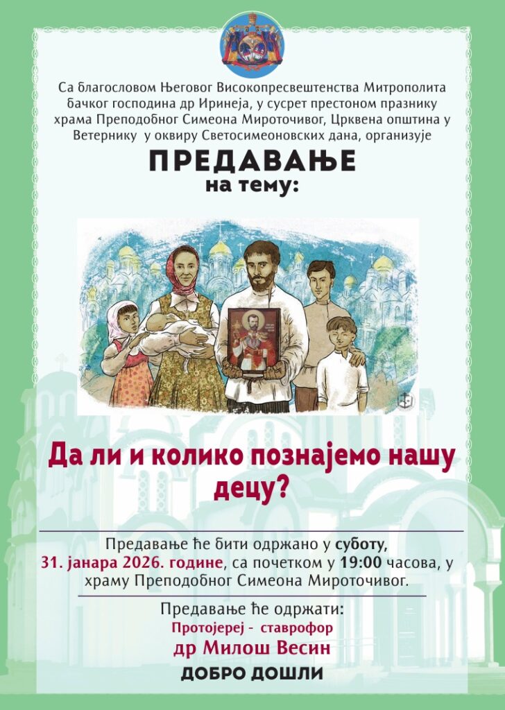 Са благословом Његовог Високопреосвештенства Митрополита бачког господина др Иринеја, у сусрет престоном празнику храма Преподобног Симеона Мироточивог у Ветернику, у оквиру Светосимеоновских дана, Црквена општина у Ветернику организује предавање на тему „Да ли и колико познајемо нашу децу?ˮ.