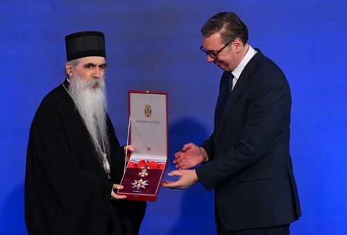 Као највиши знак јавног признања који се додељује за изузетне заслуге и дела од великог значаја за Републику Србију, Сретењски орден првог степена Високопреосвећеном Митрополиту г. Иринеју је уручио председник Републике Србије г. Александар Вучић.