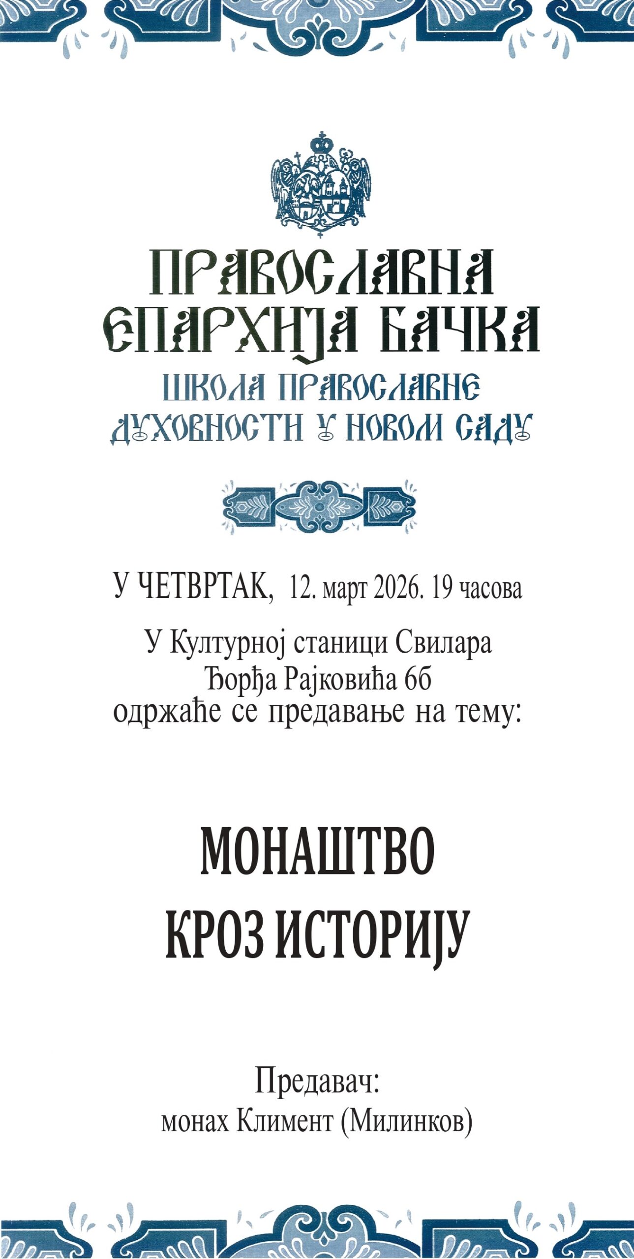 У оквиру пролећног семестра Школе православне духовности при Црквеној општини новосадској, у четвртак, 12. марта 2026. године, са почетком у 19:00 часова, у дворани Културне станице „Свилараˮ у Новом Саду, монах Климент (Милинков) ће одржати предавање на тему „Монаштво кроз историјуˮ.