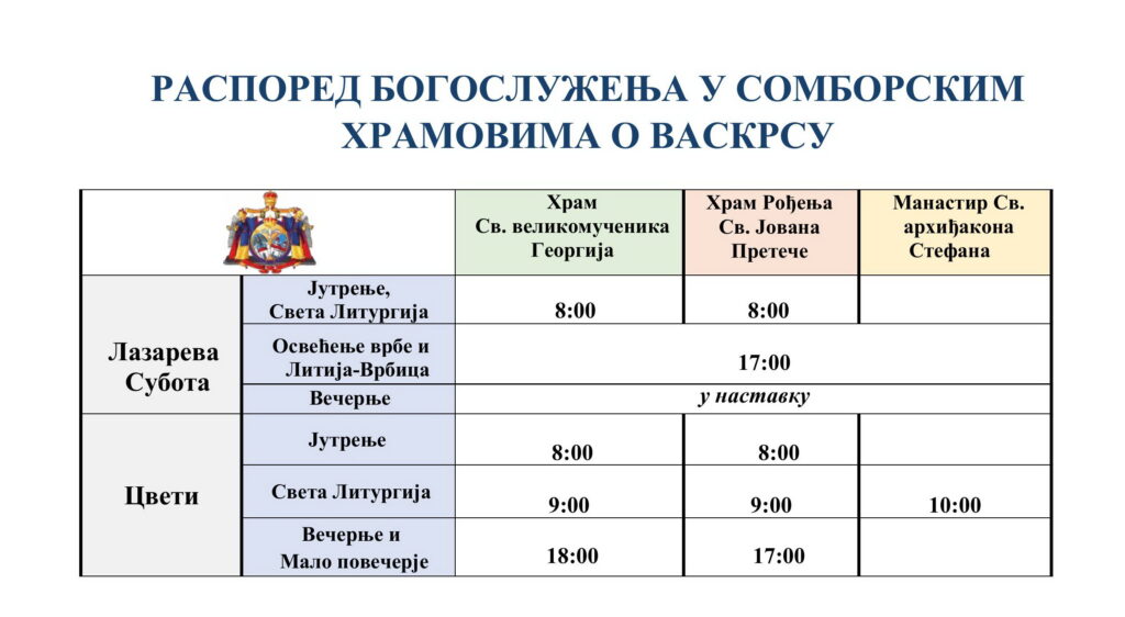 Распоред богослужења у сомборским храмовима за Лазареву суботу и Цвети 2026.