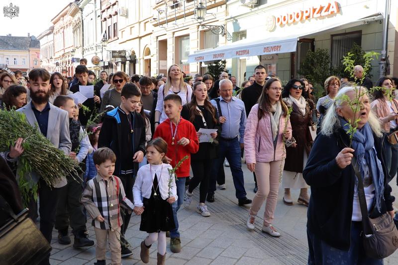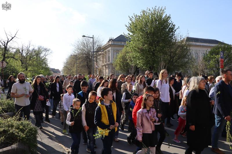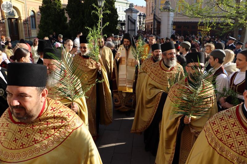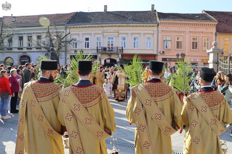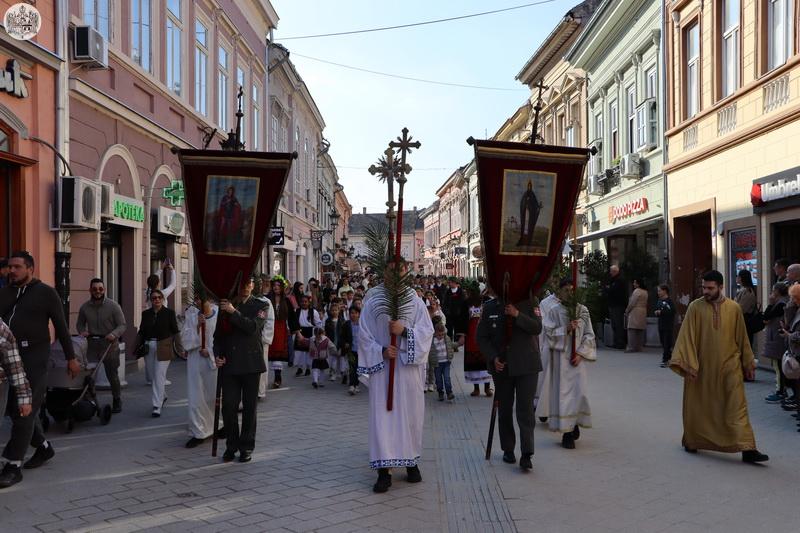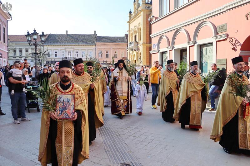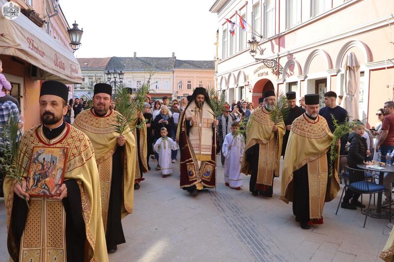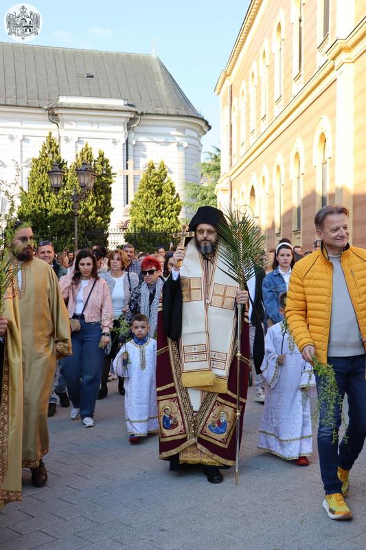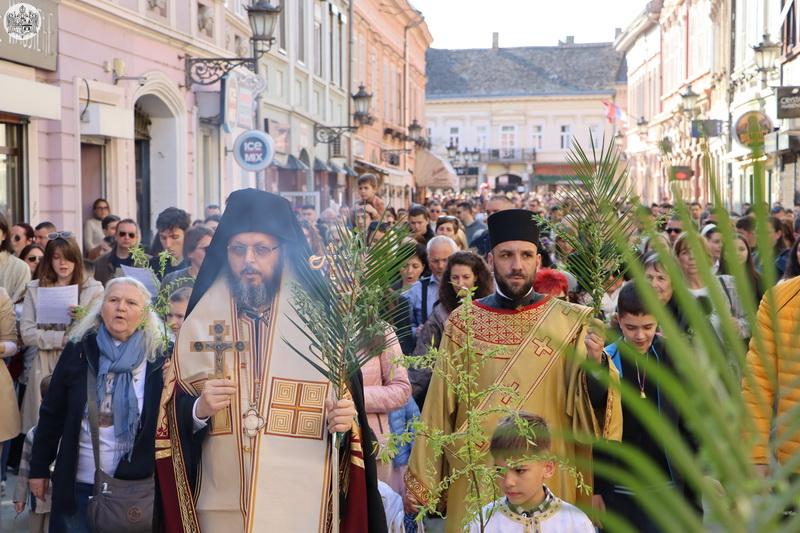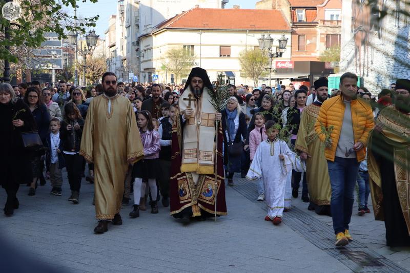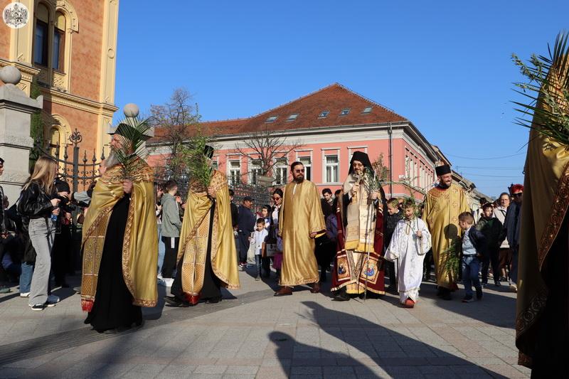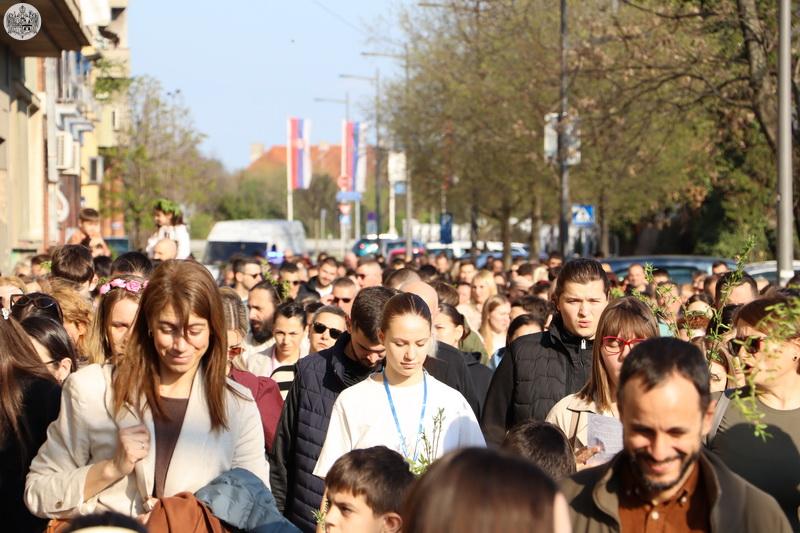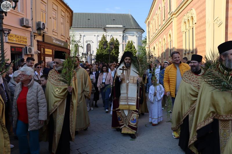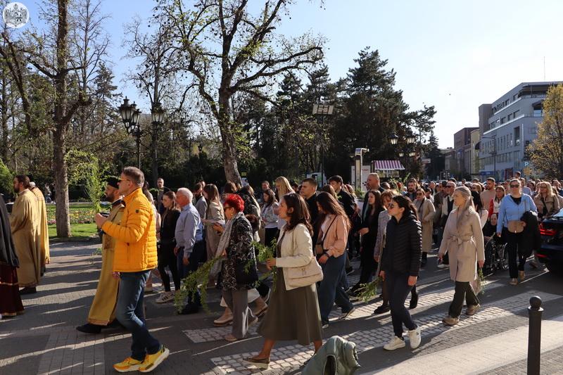 Литију свештенства и верног народа Божјег предводио је Епископ мохачки г. Дамаскин, викар Митрополита бачког. После литије, у Саборном храму је служено бденије уочи празника Уласка Христовог у Јерусалим – Цвети, у молитвеном присуству Епископа мохачког г. Дамаскина.