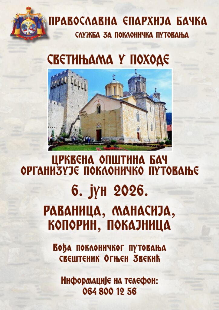 Служба за поклоничка путовања Епархије бачке „Светињама у походеˮ и Црквена општина у Бачу организују, 6. јуна 2026. године, поклоничко путовање у манастире Раваницу, Манасију, Копорин и Покајницу. Вођа поклоничког путовања је свештеник Огњен Звекић. Информације на телефон: 064/8001256.