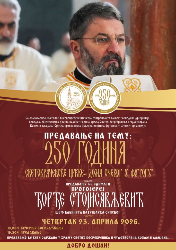 Са благословом Његовог Високопреосвештенства Митрополита бачког господина др Иринеја, поводом обележавања двеста педесет година храма Светих бесребреника и чудотвораца Козме и Дамјана у Футогу, Српска православна Црквена општина футошка у Футогу организује предавање на тему „250 година Световрачевске цркве – Дома Очевог у Футогуˮ. Предавање ће одржати протојереј Ђорђе Стојисављевић, шеф Кабинета Патријарха српског. Предавање ће бити одржано у храму Светих бесребреника и чудотвораца Козме и Дамјана у Футогу, у четвртак, 23. априла 2026. године. Вечерње богослужење почиње у 19:00 часова, а предавање у 19:30 часова.
