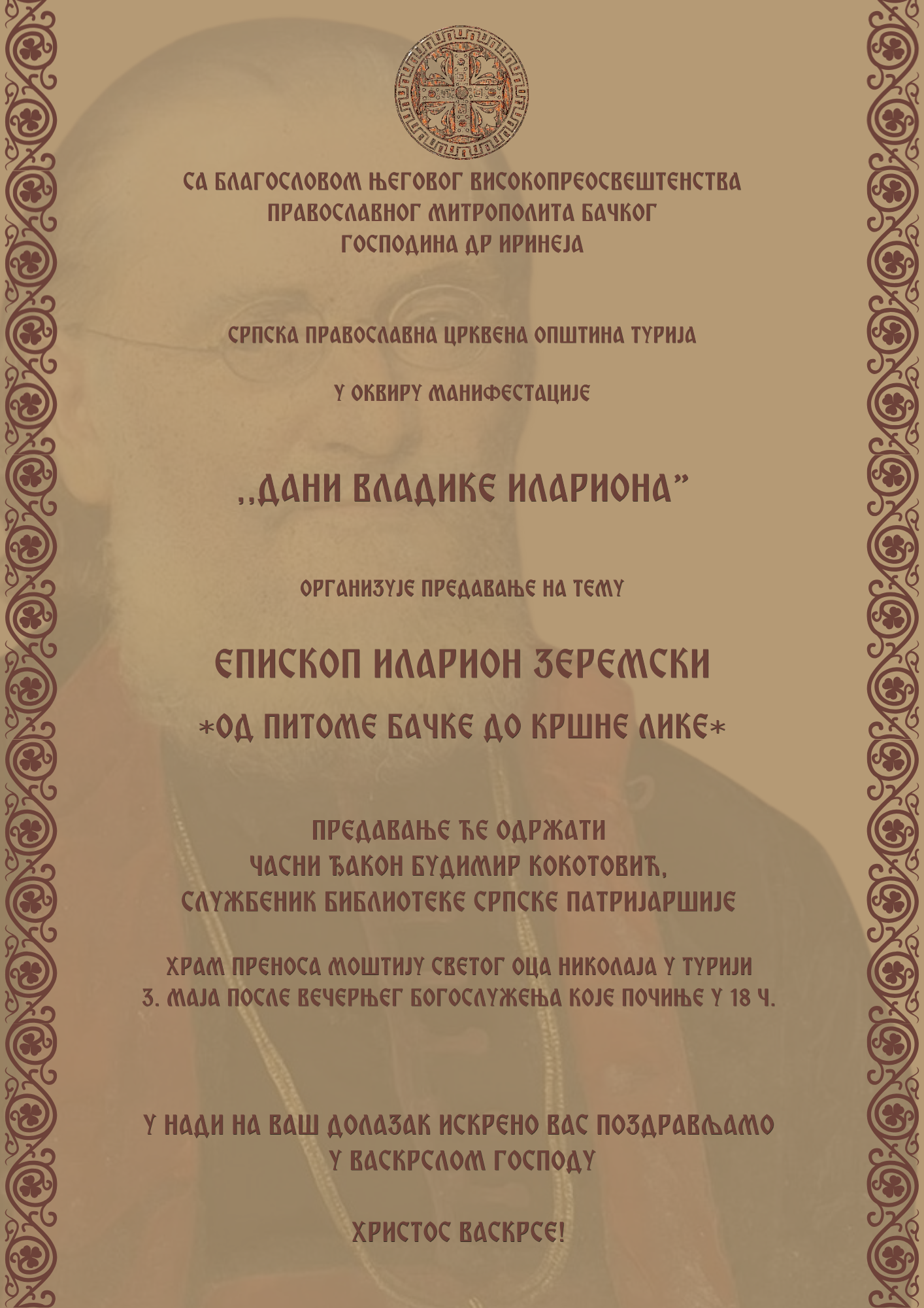Са благословом Његовог Високопреосвештенства Митрополита бачког господина др Иринеја, у оквиру манифестације „Дани владике Иларионаˮ, Српска православна црквена општина у Турији организује предавање на тему „Епископ Иларион Зеремски – од питоме Бачке до кршне Ликеˮ. Предавање ће бити одржано у храму Преноса моштију светог оца Николаја у Турији, у недељу, 3. маја 2026. године, после вечерњег богослужења које почиње у 18:00 часова. Предавање ће одржати ђакон Будимир Кокотовић, службеник Библиотеке Српске Патријаршије.