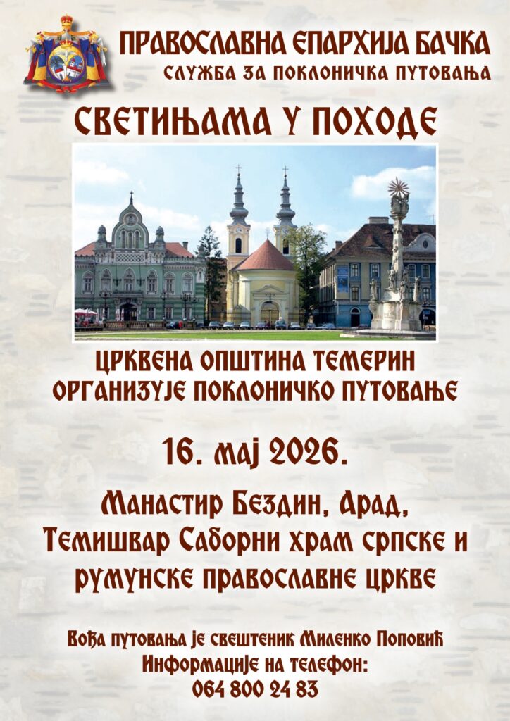 Служба за поклоничка путовања Епархије бачке „Светињама у походеˮ и Црквена општина Темерин организују 16. маја 2026. године, поклоничко путовање у манастир Бездин, у Саборни храм српске и румунске цркве, као и посета граду Араду. Вођа пута је свештеник Миленко Поповић. Информације на телефон: 064/8002483
