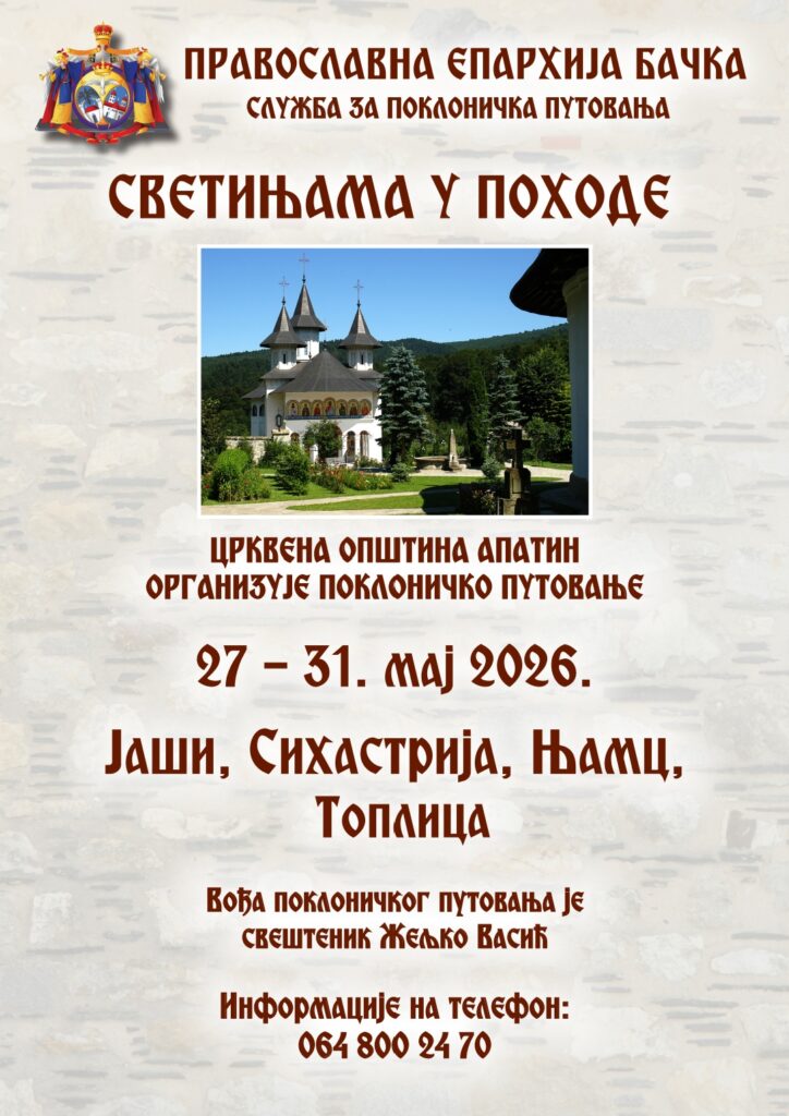 Служба за поклоничка путовања Епархије бачке „Светињама у походеˮ и Црквена општина у Апатину организују од 27. до 31. маја 2026. године, поклоничко путовање у манастире Сихастрија и Њамц, са посетом градова Јаши и Топлица. Вођа пута је свештеник Жељко Васић. Информације на телефон: 064/8002470.