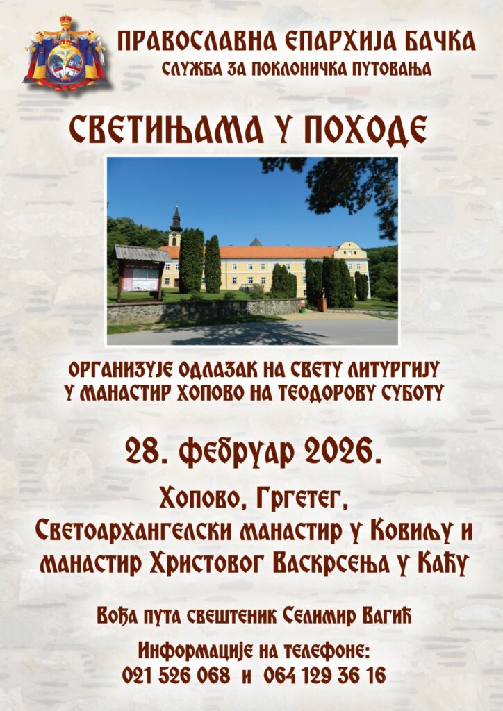 Служба за поклоничка путовања Епархије бачке „Светињама у походеˮ организује, 28. фебруара 2026. године, на Теодорову суботу, поклоничко путовање у манастире Ново Хопово, Гргетег, Ковиљ и Каћ. У Новом Хопову учешће на светој Литургији и поклоњење моштима светог великомученика Теодора Тирона. Вођа поклоничког путовања је свештеник Селимир Вагић. Информације на телефоне: 021/526068 и 064/1293616.