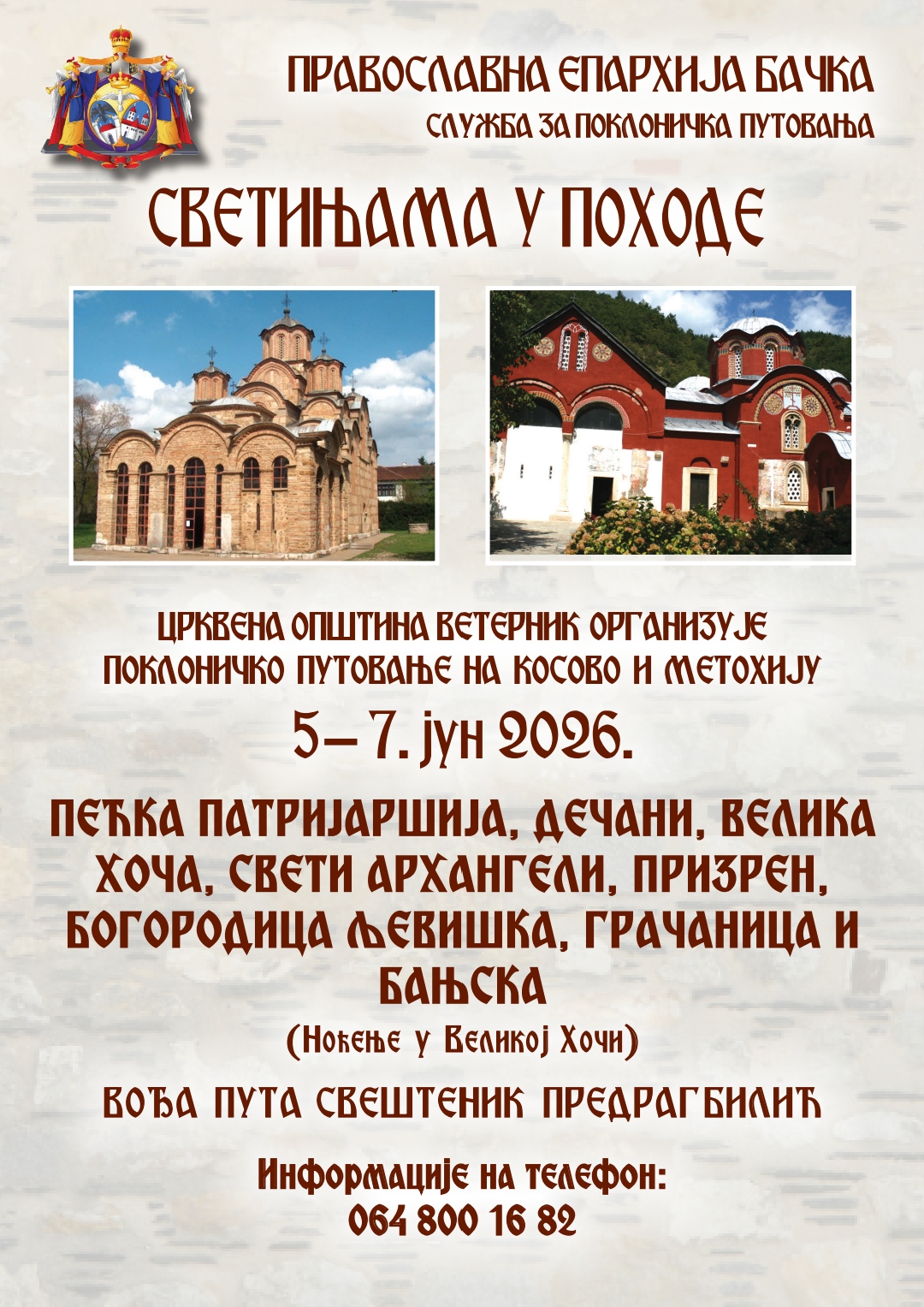 Служба за поклоничка путовања Епархије бачке „Светињама у походеˮ и Црквена општина Ветерник организују, од 5. до 7. јуна 2026. године, поклоничко путовање у манастире: Пећка Патријаршија, Дечани, Свети Архангели, Богородица Љевишка, Грачаница и Бањска. Поклоници ће посетити Велику Хочу, где је и планирано ноћење. Вођа поклоничког путовања је свештеник Предраг Билић. Информације на телефон: 064/8001682.