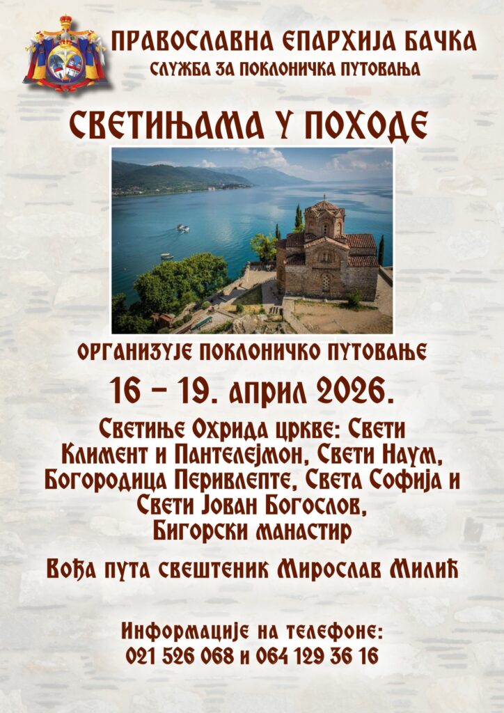 Служба за поклоничка путовања Епархије бачке „Светињама у походеˮ организује од 16. до 19. априла 2026. године, поклоничко путовање у светиње Охрида, у цркве: Свети Климент и Пантелејмон, Свети Наум, Богородица Перивлепта, Света Софија и Свети Јован Богослов, као и у Бигорски манастир. Вођа пута је свештеник Мирослав Милић. Информације на телефон: 021/526068 или 064/1293616