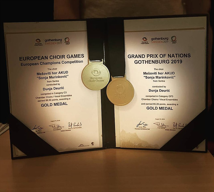 Мешовити хор АКУДУНС „Соња Маринковић“, предвођен диригенткињом Дуњом Деурић, освојио је недавно две златне медаље на Европским хорским играма у